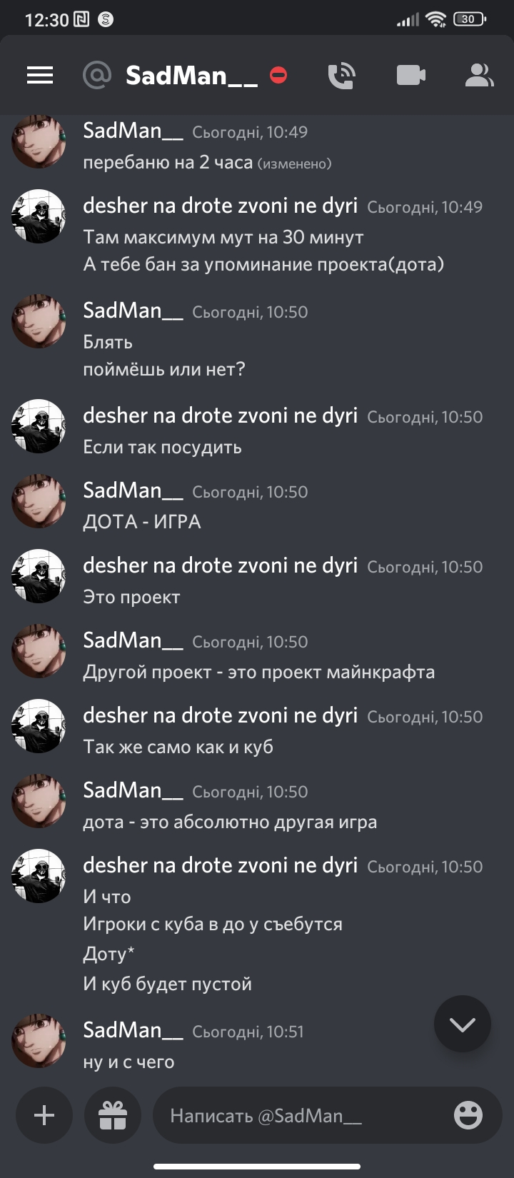- Описание ситуации:Бан по причине 2.2(неуместная критика/оскорбление/унижение/принуждение/провокация/сообщения не по теме/троллинг в сторону Команды проекта или самого ничего такого не было , сказал саду шо он гавнюк за то что вспоминал другой проект(доту) вчера , (Sadman_ - безбридельник) скидуй сюда скрин переписки щас будем разбираться)( мой дс desher na drote zvoni ne dyri#0185 - Енот звони поговорим за твой район и за тебя тоже)