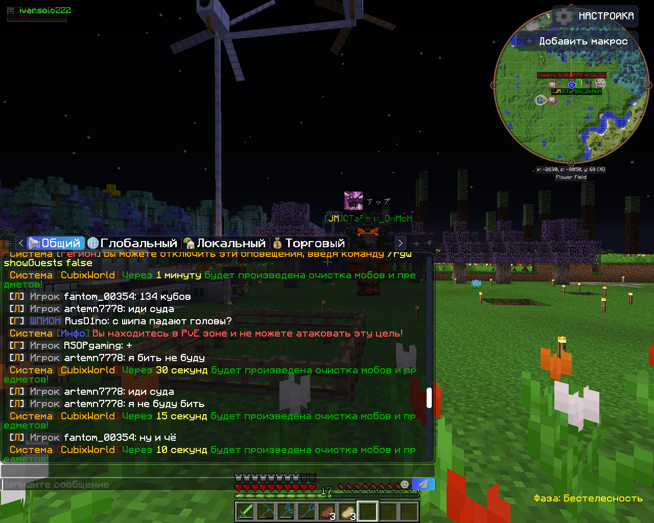 - Описание ситуации: добрий вечер меня на TechoMagic#1 Обманул 1 игрок artemn7778 я продавал подсолнухи он кинул тп я принял его заявку на тп он потом мне пишет иди сюда(из теретории моего рг) я говорю нет ты меня убьеш он сказал нет(скрин есть) я поверил но все вещи снял и он меня застопил и убил прошу наказать нарушителя