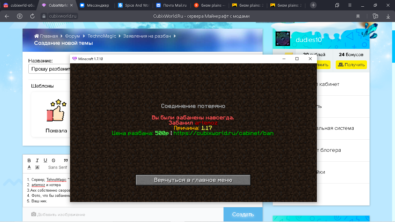 Блокировка "По железу" была выдана ДО вайпа за выдачу банов 4-ым игрокам по причине "С новым годом" - иными словами бан за просто так. Обычный бан был выдан действительно по вашей просьбе, но только по причине 1.17. Не передавайте свой аккаунт другим людям и не будет проблем. Отказано и закрыто
