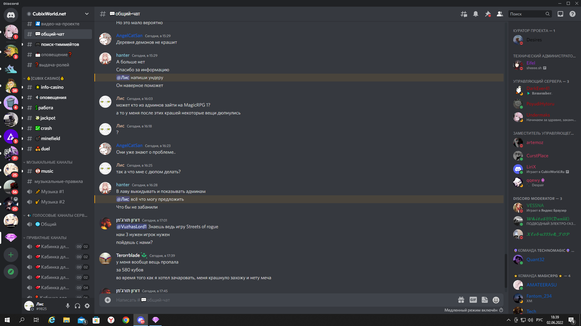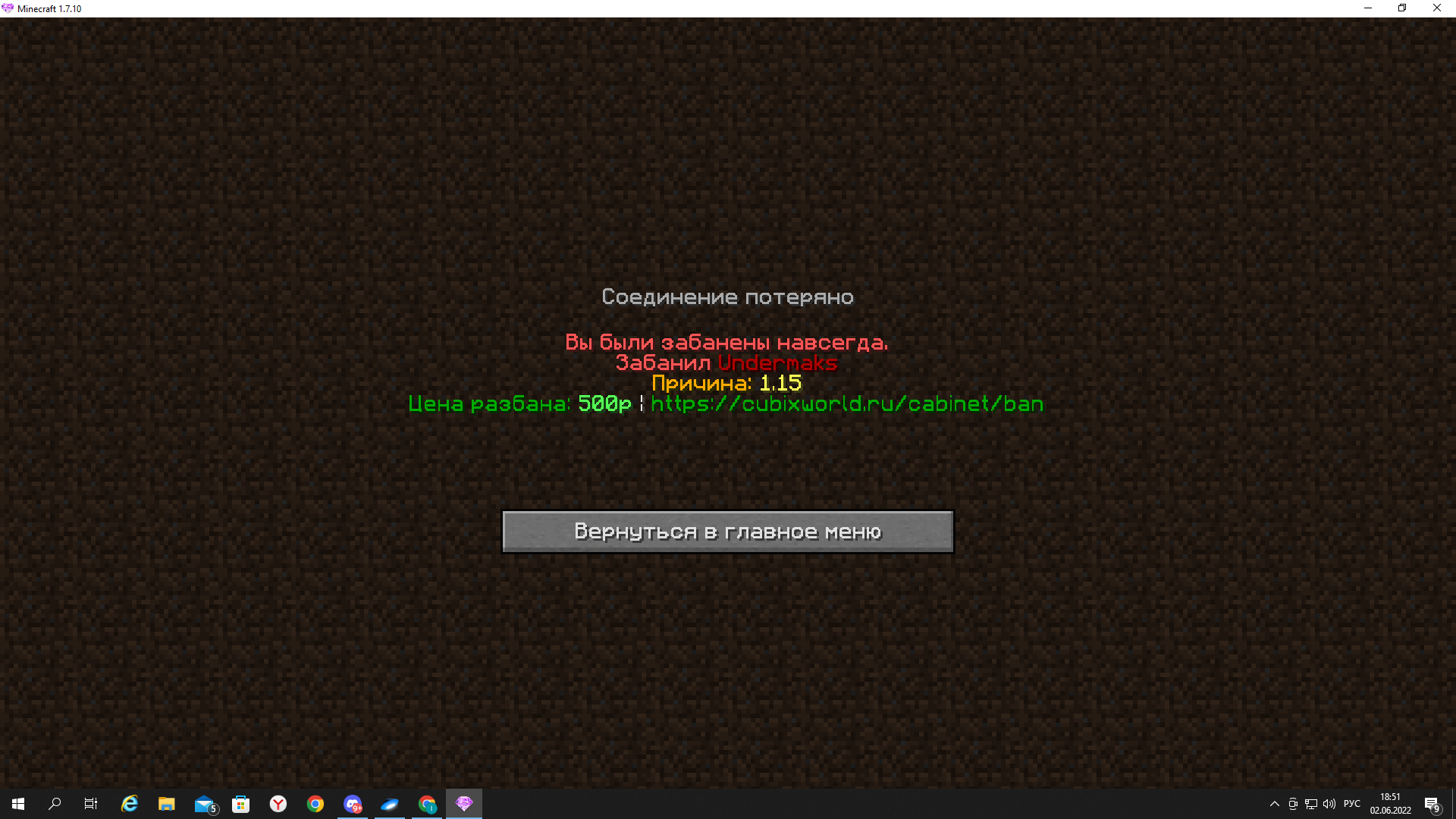 3.Описание ситуации от Вашего лица; сегодня на серверы были краши и во время них у меня дюпнулись ресы сначала я спросил у друга что мне делать он сказал ждать админов,потом я пошёл в дс кубикса спросить что мне делать и даже звал админов но т.к никто не зашёл я решил выйти и потом зайти , а когда зашёл у меня уже был бан.