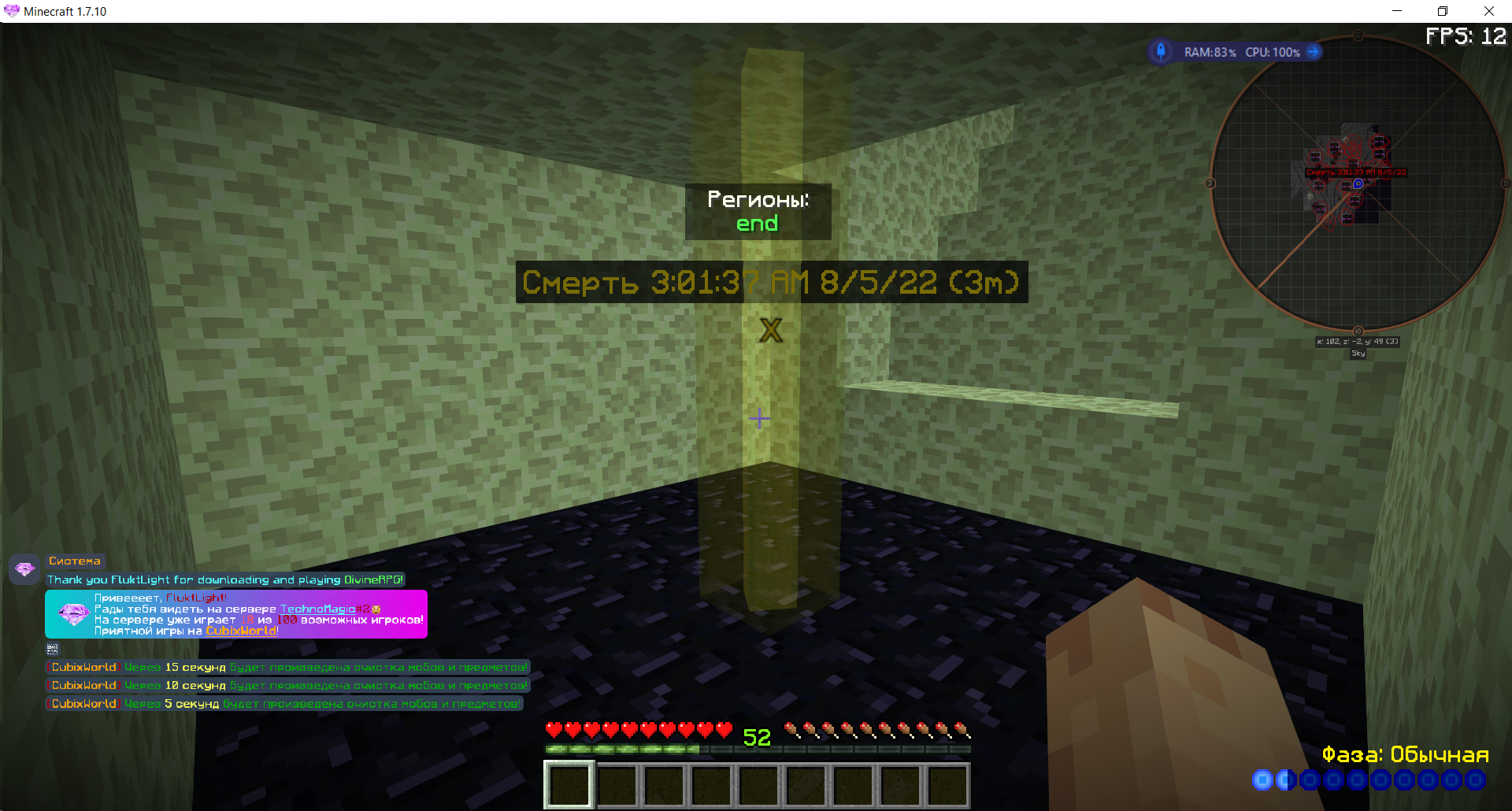 - Описание ситуации: Благодаря весьма продуманному обустроству площадки прибытия в край меня прибили сразу по прибытию в край, а когда я вернулся ресурсы были забраны находящимися там игроками. Я как-то не ожидал что там будет настолько "безопасно" и я потеряю свой квант и немало ценных ресуросов (собирался немного пофармить эндерперлов), посему, скорее всего я уйду с этого проэкта, раз у тутошних специалистов настолько специфические понятия дизайна.