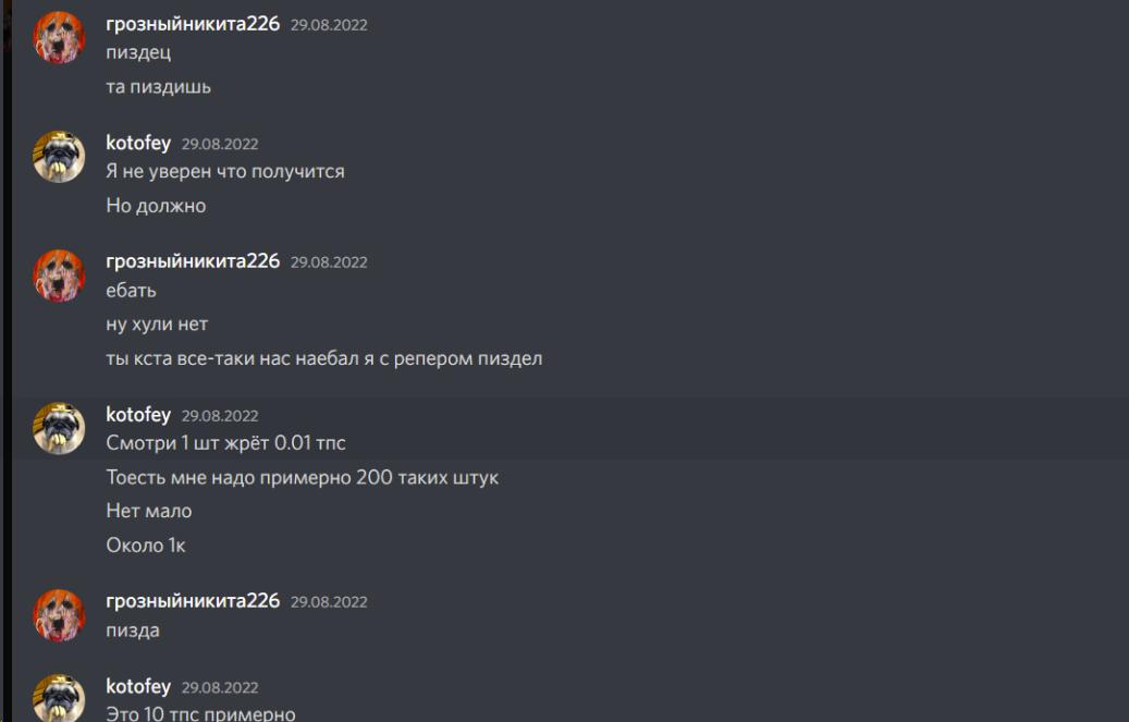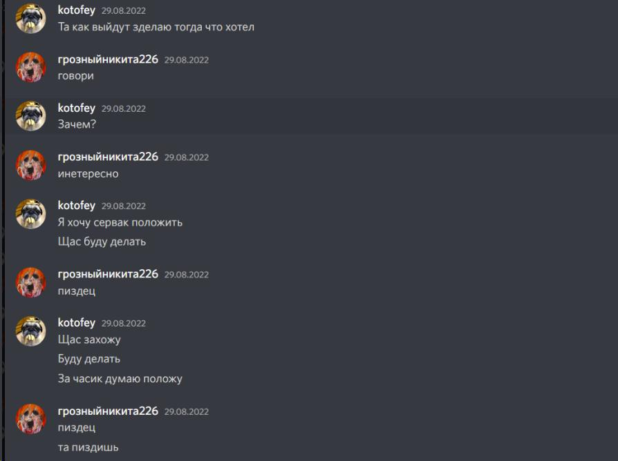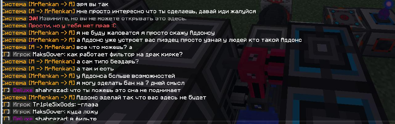 - Описание ситуации:Здраствуйте, я бы хотел пожаловатся на одного плохо человека,только зашел на сервер и он начал мне угрожать,баном,пермаментным, баном расправой в игре и всякое такое.Говорит что подтянет связи и всех моих друзей закинут в бан и меня в том числе.Я понимаю что врядли что-то возможно сделать с ним ведь он вливает огромные бабки в ваш проект и дружит с админами, но за неделю он улетел в бан раз 10.Он мешает огромному количеству игроков спокойно играть он в том-же числе дюпает как он говорит "это секрет команды Аддонса " пытается положить сервер есть скрины переписки в дискорде,продает ресурсы ниже рынка,в спавнерах у него 30 эссенций визера,нагружает сервер своей базой,гриферит других игроков и так далее.Доказательств не так уже и много но я думаю вы знаете все из выше перечисленного поэтому вот так и получается.Спасибо.В тот момент я находлися на другом аккаунте из-за бана на основном.