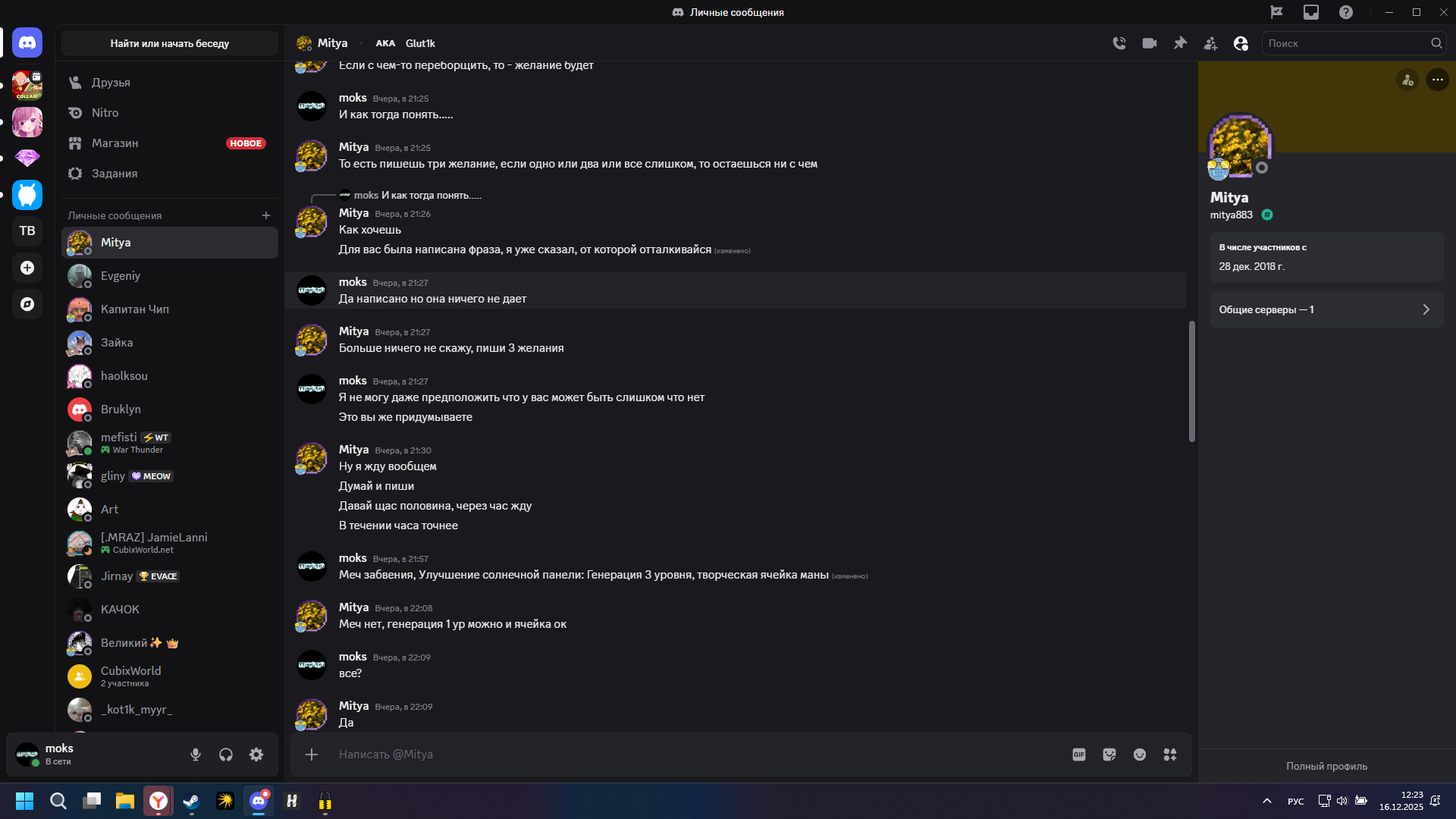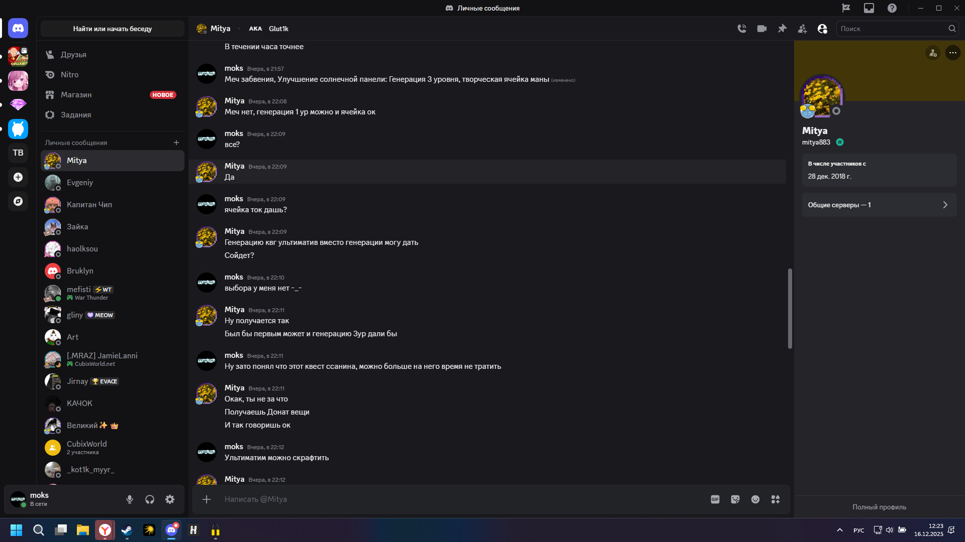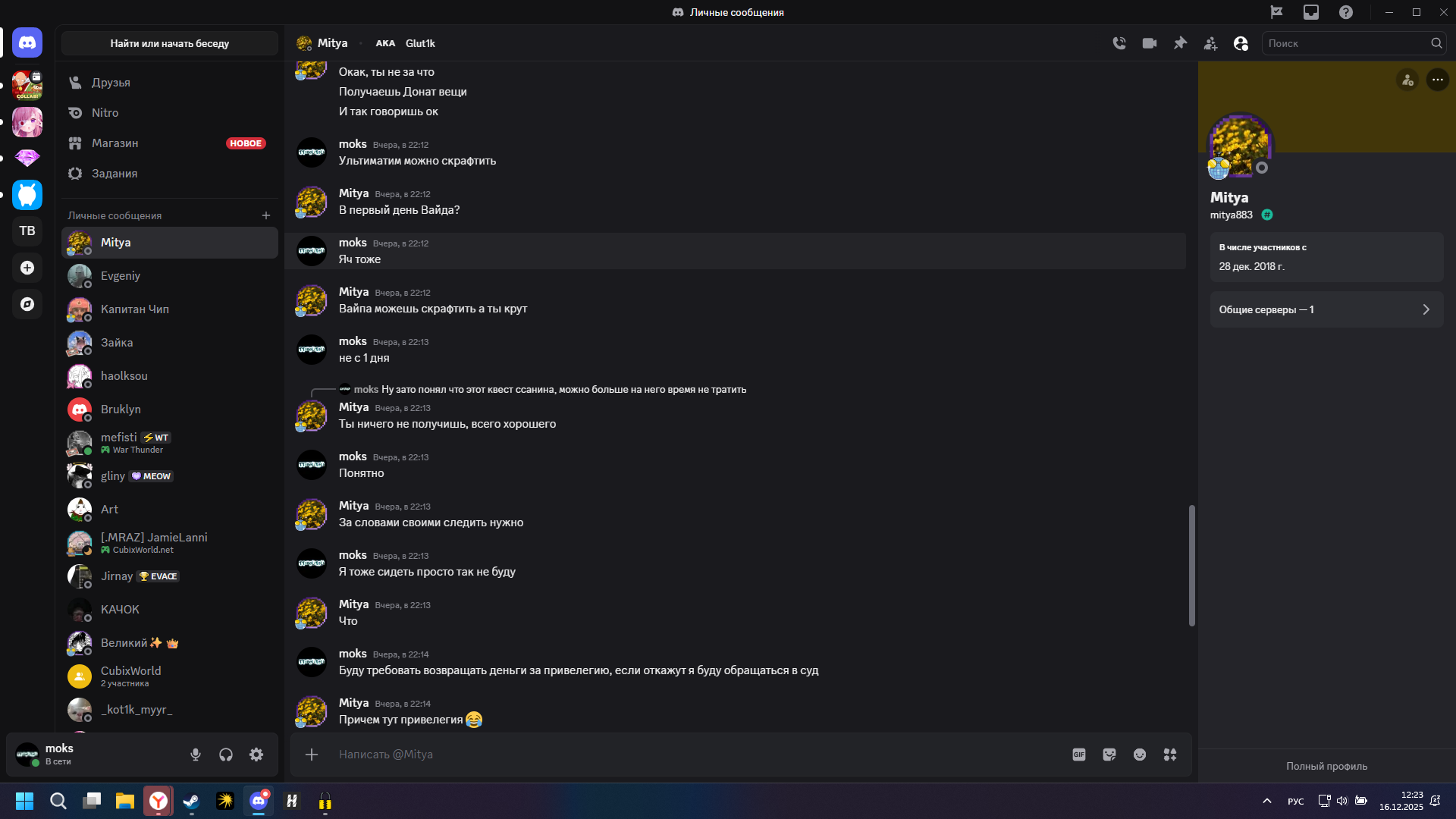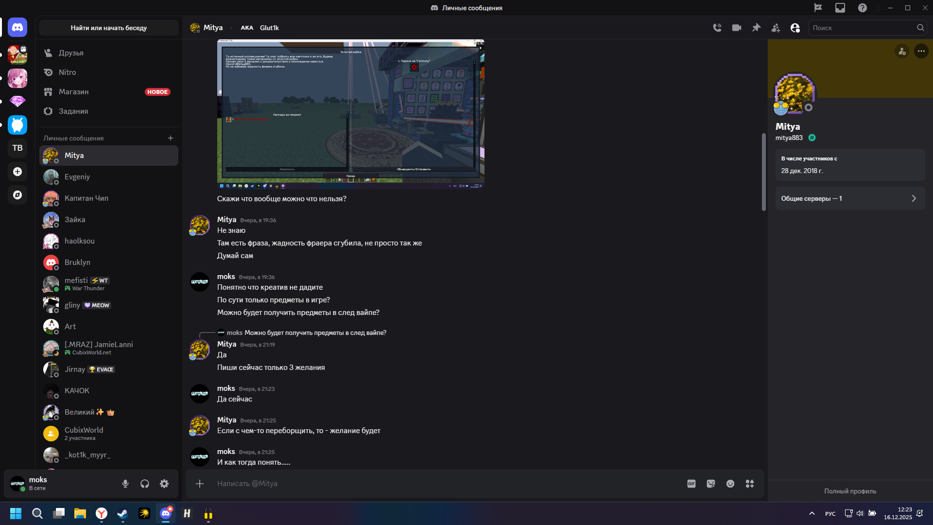 2. Описание ситуации, расскажите поподробнее: Здравствуйте, произошла очень не приятная для меня ситуация. Я игрок CubixWorld ник: TToBeLiTeLb, сервер TechnoMagic. Проходил квест под названием «Коллекционер» за выполнение которого, нужно будет написать Администратору Mitya (Discord) прикладываю скриншот из игры и сервера TechnoMagic, где описано данные квеста. Я спросил у администратора «Скажи что вообще можно что нельзя?» Ответ: «Не знаю» Всю переписку я приложил так же на скриншотах. Почему меня так расстроило то что администратор толком не объяснил что да как, игрок должен гадать сам, я решил написать 3 предмета. Меч (можно получить только донатом в аукционе), Улучшение (только покупка), ячейка на ману (скрафтить,донат, аукцион), т.е можно было получить только те предметы которые я и так могу скрафтить сам. Я не понимаю смысл этого квеста, я потратил на него кучу времени и сил, чтобы получить просто ничего. Так как администратор просто сказал что ничего не получу из за агресивности. Ну да я вспылил немного но я из за того что потратил очень много времени на этот квест, чтобы получить то что можно и так скрафтить. По логике «Сказке» «Золотая рыбка» она выполняет вообще любое желание. Было бы справедливо если можно было просто поменять на другие предметы хотя бы, но не так что «Пиши мне сразу 3 предмета если какой то предмет будет дорогим (по мнению администратора) то это сразу -1 желание, либо 2,3 предмета так же. Я настролько сильно растроился. Потому что администраторы(некоторые) ведут себя так, как будто игроки их игрушки.