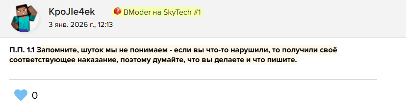 Наказание: Мут от 5 минут / бан от 30 минут / Перманентный бан (зависит от тяжести нарушения). При многократном повторении нарушений - бан по железу/блокировка аккаунта целиком.