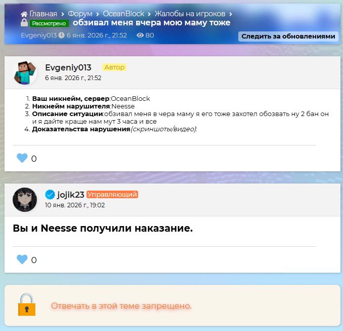 - Описание ситуации: После выставления жалобы от 6 января 2026 года (https://cubixworld.net/forum/topic/51991-oskorblenie-i-mnogokratnoe-poproshaynichestvo), я уведомил нарушителя о том, что на него была создана жалоба, что бы он мог с ней ознакомиться. После чего, нарушитель по старой жалобе начал оправдываться что перепутал меня с другим человеком и вообще это было адресовано не мне и выкатил жалобу на моё имя не имея ни единого доказательства моего нарушения (т.к. нарушения не было ни разу, даже Олег меня ни разу не мутил). Администратор решил выдать наказания мне и прошлому нарушителю. Жалобу считаю некорректной!