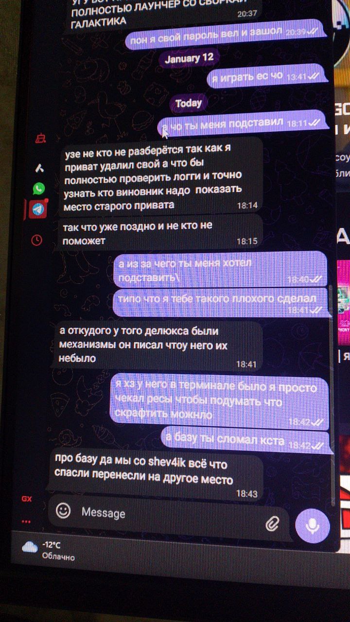 vodixo,Galaxy,VladCatDog2020 переставил приват со своим другом где были много моих ресурсов он говорит что ктото грифанул ,потом я нашел тима пришел к нему на базу телепортируется VladCatDog2020 с модером и пишет что я его грифанул! хотя я ничего не делал докозательство есть вчерашняя переписка где он говорит что он все подстроил!