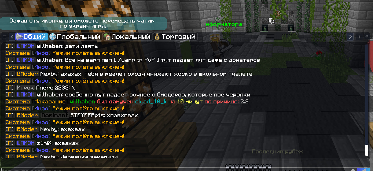 - Описание ситуации: писал в чат звал людей на пвп, выдал мут за 2.2, но 2.2 гласит о том, что запрещены провокации в сторону проекта или команды проекта. Максимум были высказывания о BModer, но бмодер не является командой проекта, об этом гласит пользовательское соглашение этого игрового проекта