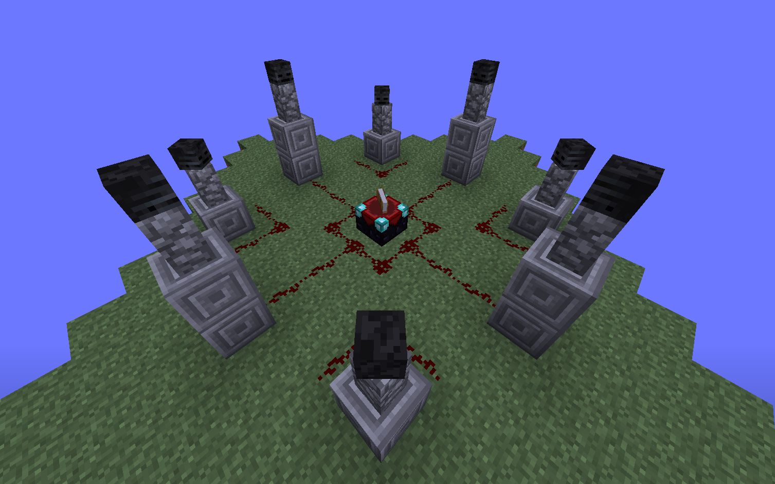 Вот такая схема необходима - плоскости формирования будут ставить нужные блоки для призыва, а поршни ломать черепа скелетов иссушителей, что решат встать на место каменных оград.