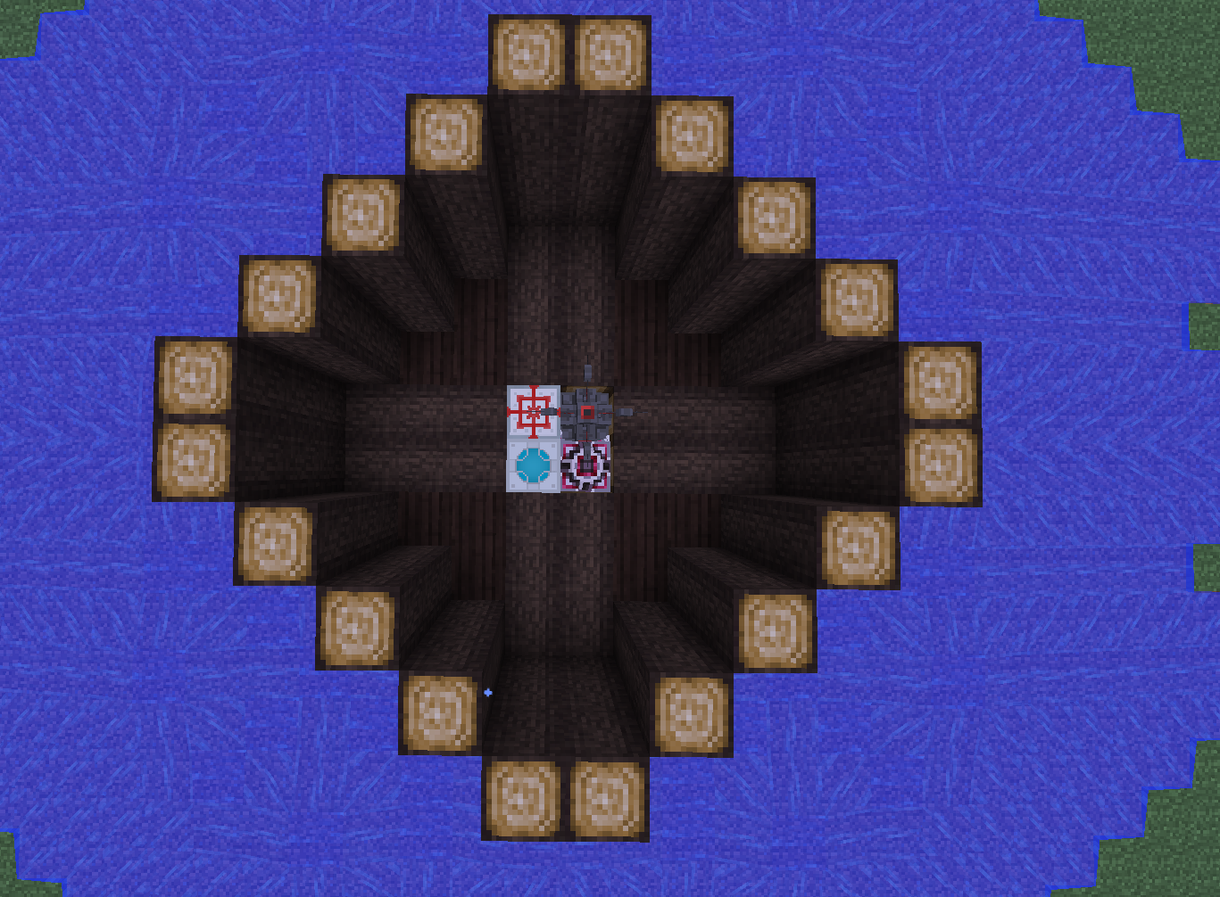 На изображении видно что округ залит водой, это предотвращает него лишние телепортации в округе, но если боссов будет слишком много, то Эндер Охотник все равно сбежит! Также необходимо телепортировать боссов на самый нижний этаж базы, иначе опять таки, Эндер Охотник решит сбежать.
