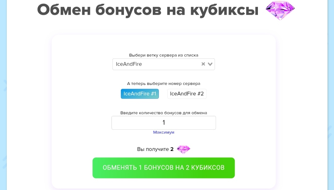Добрый день, обмен бонусов в кубиксы происходит по данной ссылке *тык*. Укажите ветку серверов, номер сервера и количество бонусов, которые хотите перевести.