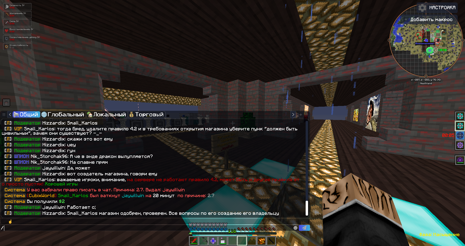 Также модератор jaywillwin , выдал мне мут по пункту правил 2.7(Запрещен любой обман), за моё сообщение :"Уважаемые игроки, внимание, на сервере не работают правило 4.2, может быть и другие правила это просто пустяк! Хорошей игры". Но, если моё сообщение является обманом, то по какой причине магазин /warp magaz был одобрен?!