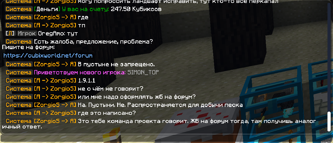 Порча ландшафта в основном мире. Поговорив с Старшим Модератором, он заявил, что в обычном мире в пустыне разрешено копать 3х3 и портить ландшафт. Следую правил 1.9.1.1. "Запрещено копать в основном мире более 3х3 вне вашего привата.". У меня назревает вопрос, почему я не прав? Скрины с координатами и перепиской прилагаю.