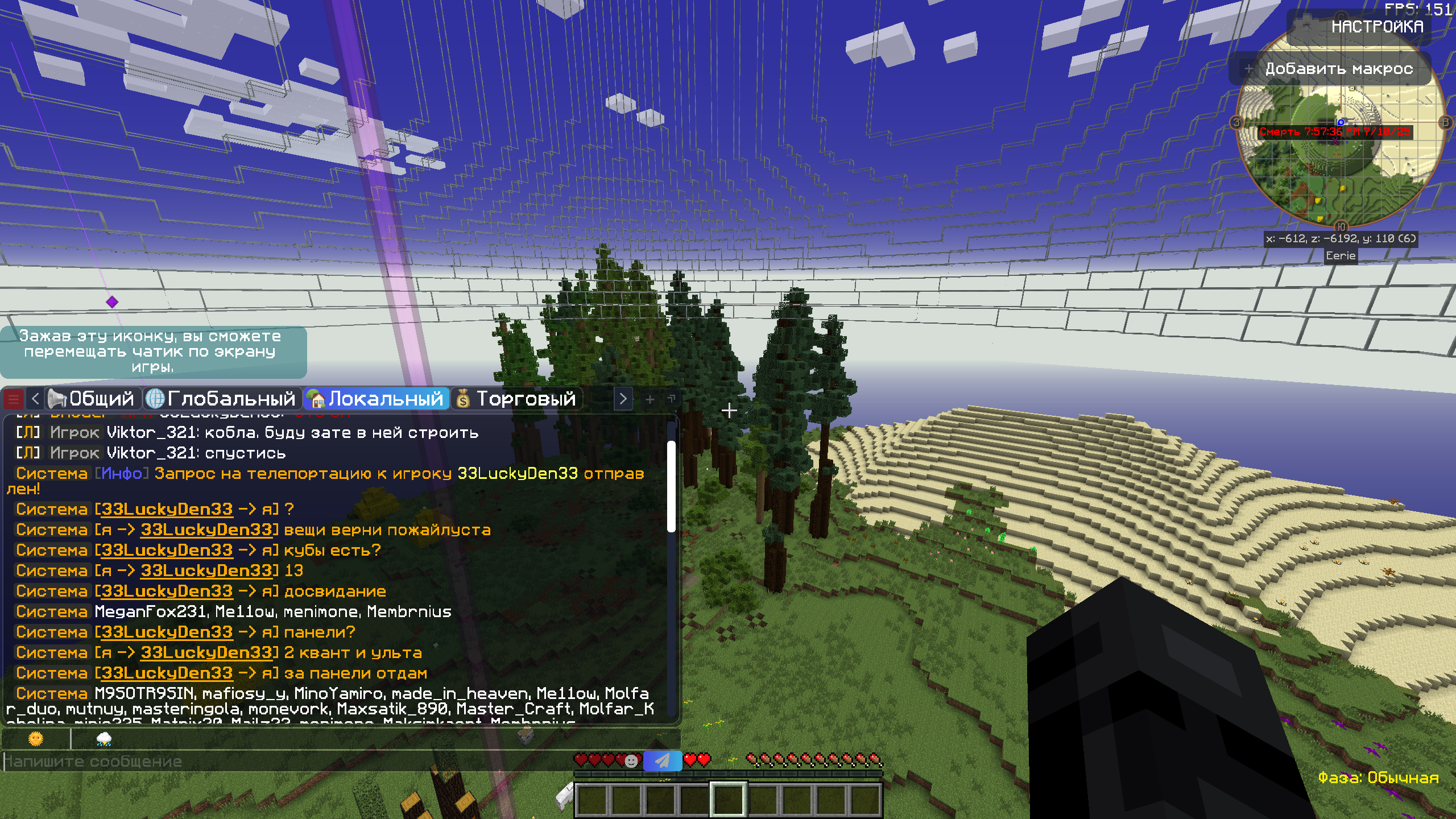 - Описание ситуации: телепортировался данный господин ко мне дамой. спустя пару минут он убил меня на крыше моего привата. попросил вернуть вещи. он говорит что вернёт их за все мои панели. Я понимаю что покупка привелегии BMODER это с одной стороны хорошо. но с другой это просто ужас когда ее покупают такие индивидумы, отбивает желание играть у многих игроков. прошу помочь мне вернуть вещи. квант броню, грави-кирасу и ваджру. проверьте аккаунт 33LuckyDen33 он на проэкте 9 дней и мб обходит бан.