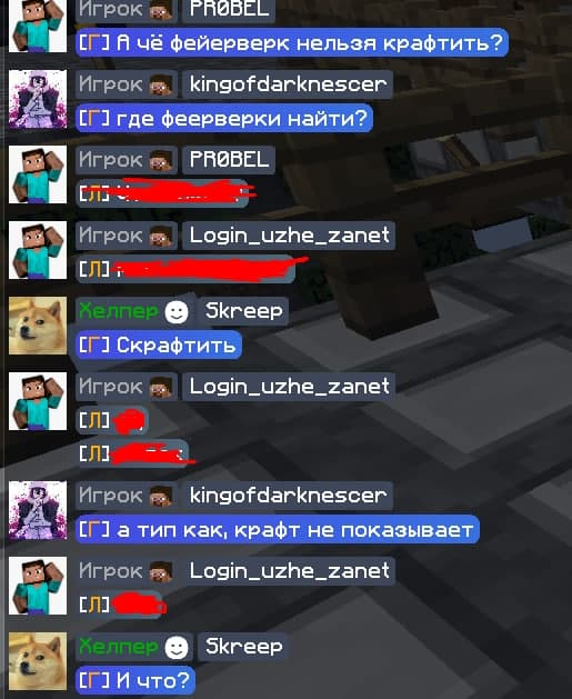 - Описание ситуации: Данный хелпер в который раз вкидывает в чат "шутки", то ли что, я не могу его понять. Игрокам нужна помощь, а он отвечает тупостью. Приложу 2 скриншота, на первом я и ещё один игрок спросили, как сделать фейерверки, на что получили ответ: "Скрафтить", после логическое вопроса, что в JEI нету крафта фейерверка, он вкидывает фразу "И что?", вместо того, что бы посоветовать поискать в интернете. На втором скриншоте мы можем наблюдать ситуацию, как игрок попросил помощи в Таумкрафте, на что получаем ответ "Плакать". Попрошу провести беседу с хелпером, ибо качество его работы желает лучшего и это не только мое мнение.