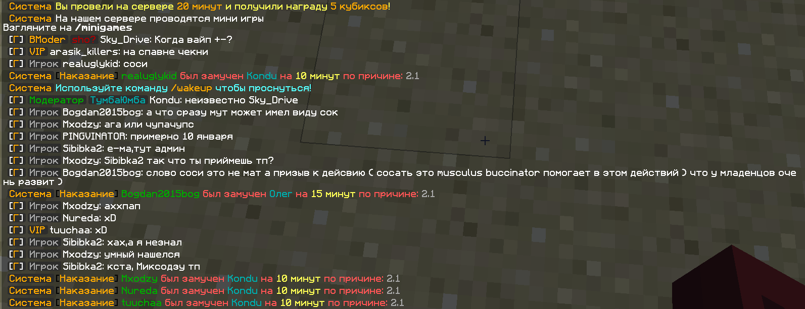 Ситуация следующая. Человеку выдали мут, другой игрок начал шуточно (как предполагаю?) его оправдывать, за что тоже получил мут, что возможно и справедливо, можно отметить. Несколько игроков, включая меня, похихикали, отправив по одному сообщению. За что тоже получили мут. (К слову, если проследить за чатом, то "хихиканье" со стороны Sibibka2 тоже присутствовало, но это решили пропустить, по какой то причине?) Итоговый вопрос или "возмущение". Единственная заметка из пункта 2.1. едва ли подходящая к причине мутов, это запрещено "оскорблять или насмехаться (в виде троллинга) над игроками или их родственниками". Оскорблений точно не присутствовало, как и троллинга над игроком. За что игроки дружно получили муты?