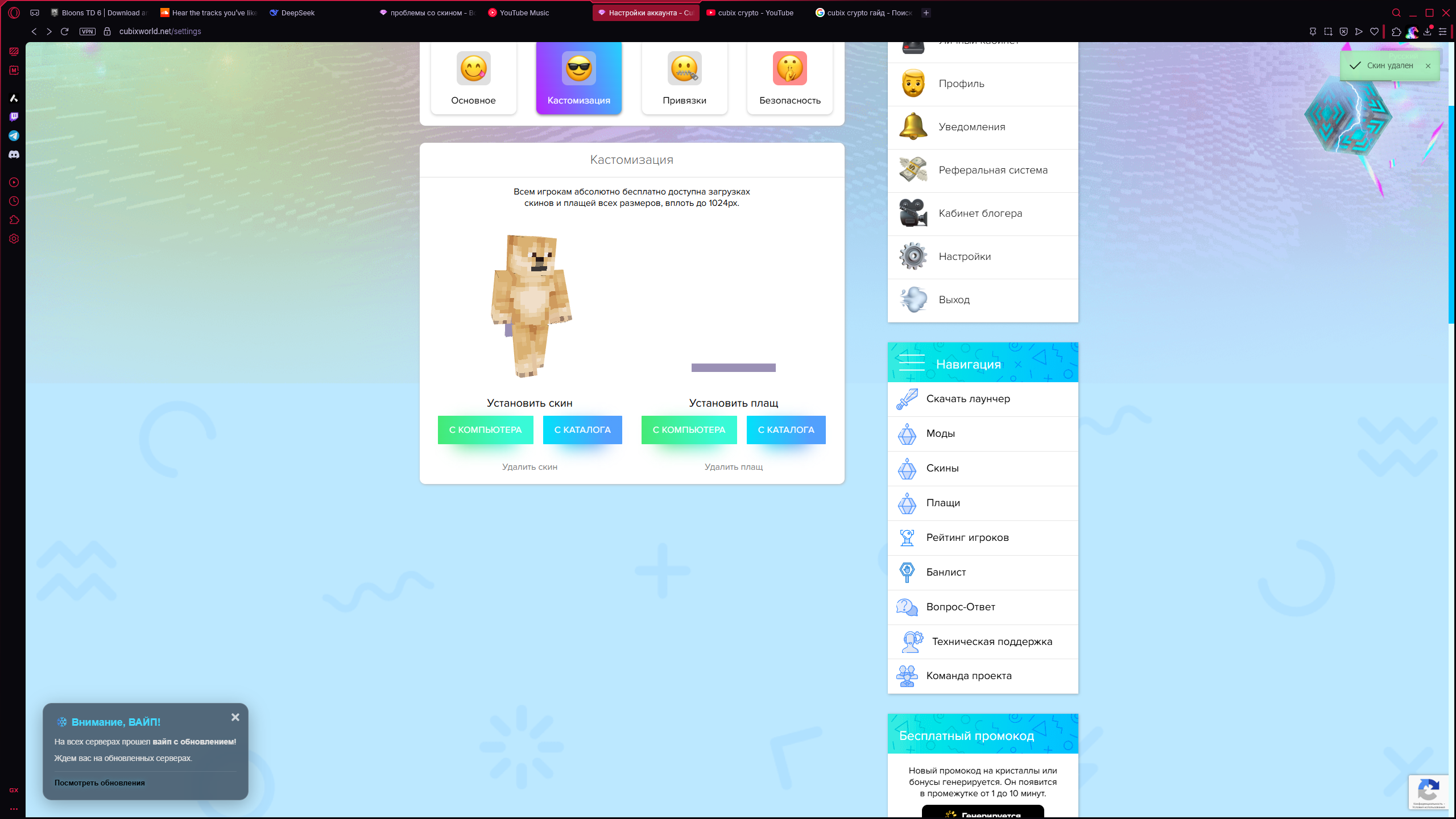- Интересующий вас вопрос: На сайте был скин поиграл неделю скин скинулся хожу стивом это не визуальный баг у других я тоже стив а также в табе нету аватарки только у меня, пробывал менять на другие с каталога ничего не меняется скин не ставится, лаунчер с файлами удалял не помогло.