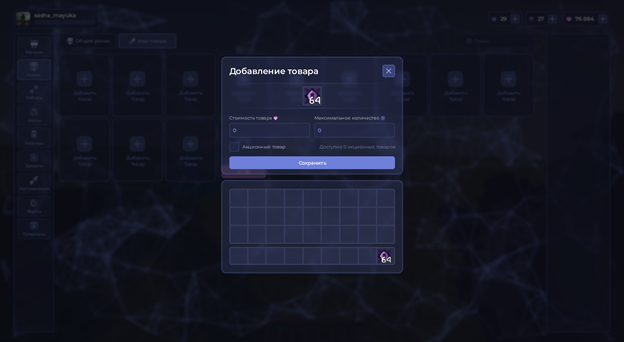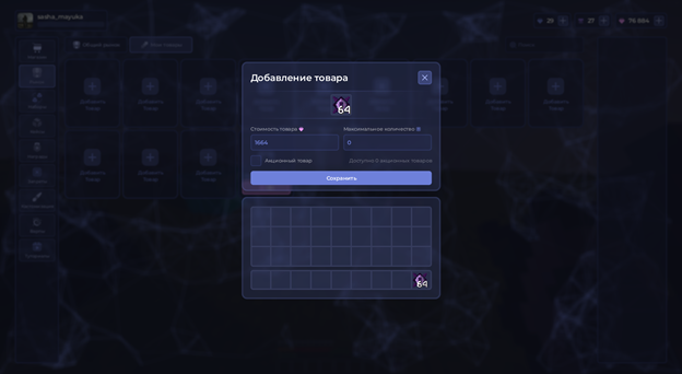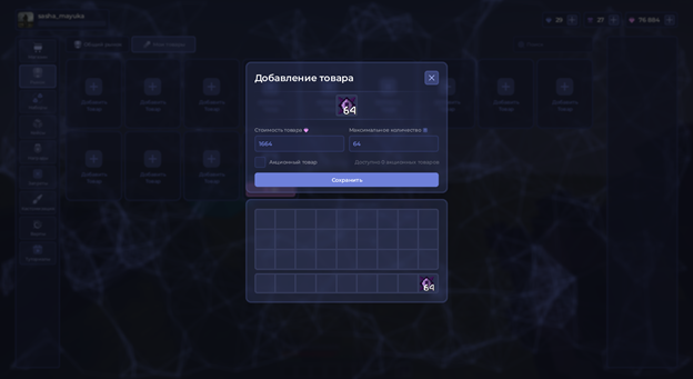 Теперь добавим новый товар. Нажимаем на стак предметов в инвентаре, стак зависит от желаемого количества продаваемого товара за одну операцию, выставляем цену. Выбираем, ли будет наш товар акционным, но нужно учитывать, что их ограниченное количество. Далее указываем максимальное хранимое количество товаров на рынке для автоматической поставки предметов (если это требуется).