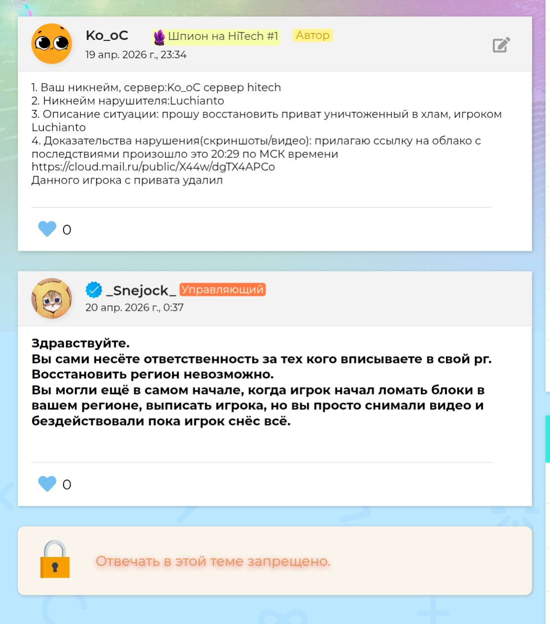 3. Описание ситуации: прошу восстановить приват уничтоженный в хлам, игроком Luchianto