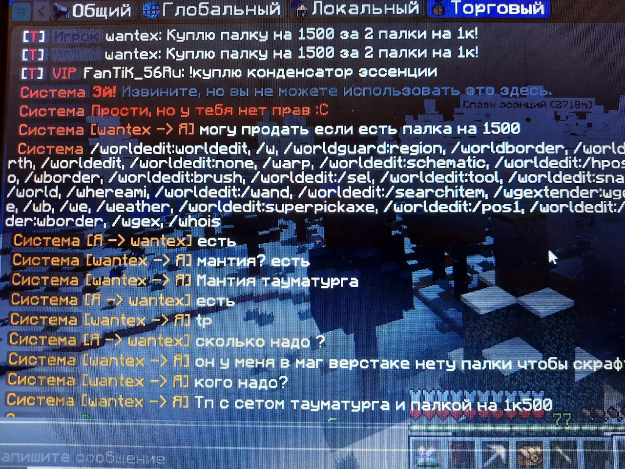 4. Описание ситуации, максимально развернуто и ясно;Обманул в торговом чате. Была предложена сделка палочка на 1500 вис(с моей стороны) Конденсатор эсенции(с его стороны) Я дал ему палочку, он ей воспользовался не заплатив (взамен я ничего не получил). А потом телепортировал меня на спавн. Прошу разобраться в этой ситуации. +(мат) в лс