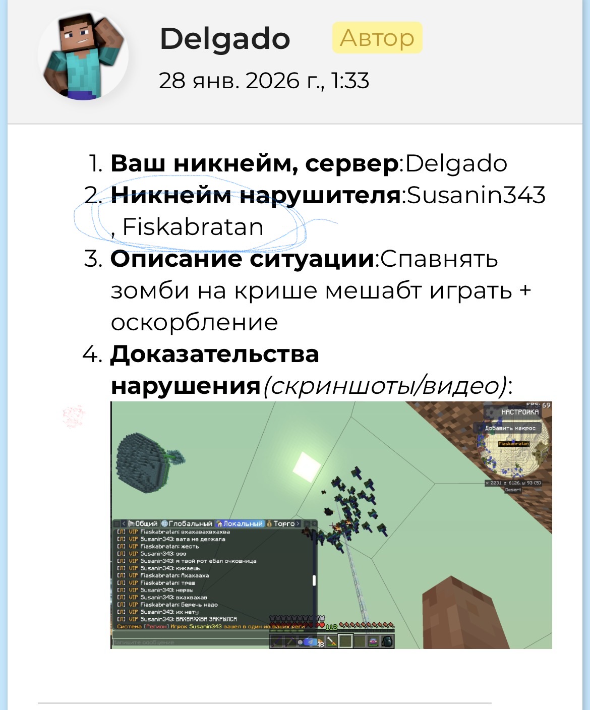 В данной жалобе https://cubixworld.net/forum/topic/52715-meshabt-igratjh которую оставил Сударь Delgado он указал в ней 2-х игроков, которые ему мешали,а именно: Fiskabratan.То есть,с его слов,нарушал Fiskabratan! но никак не Fiaskabratan.Бан был выдан на 2 дня.Сегодня уже кончиться,прошу возместить мне ущерб за потраченные 2 дня и нервы.